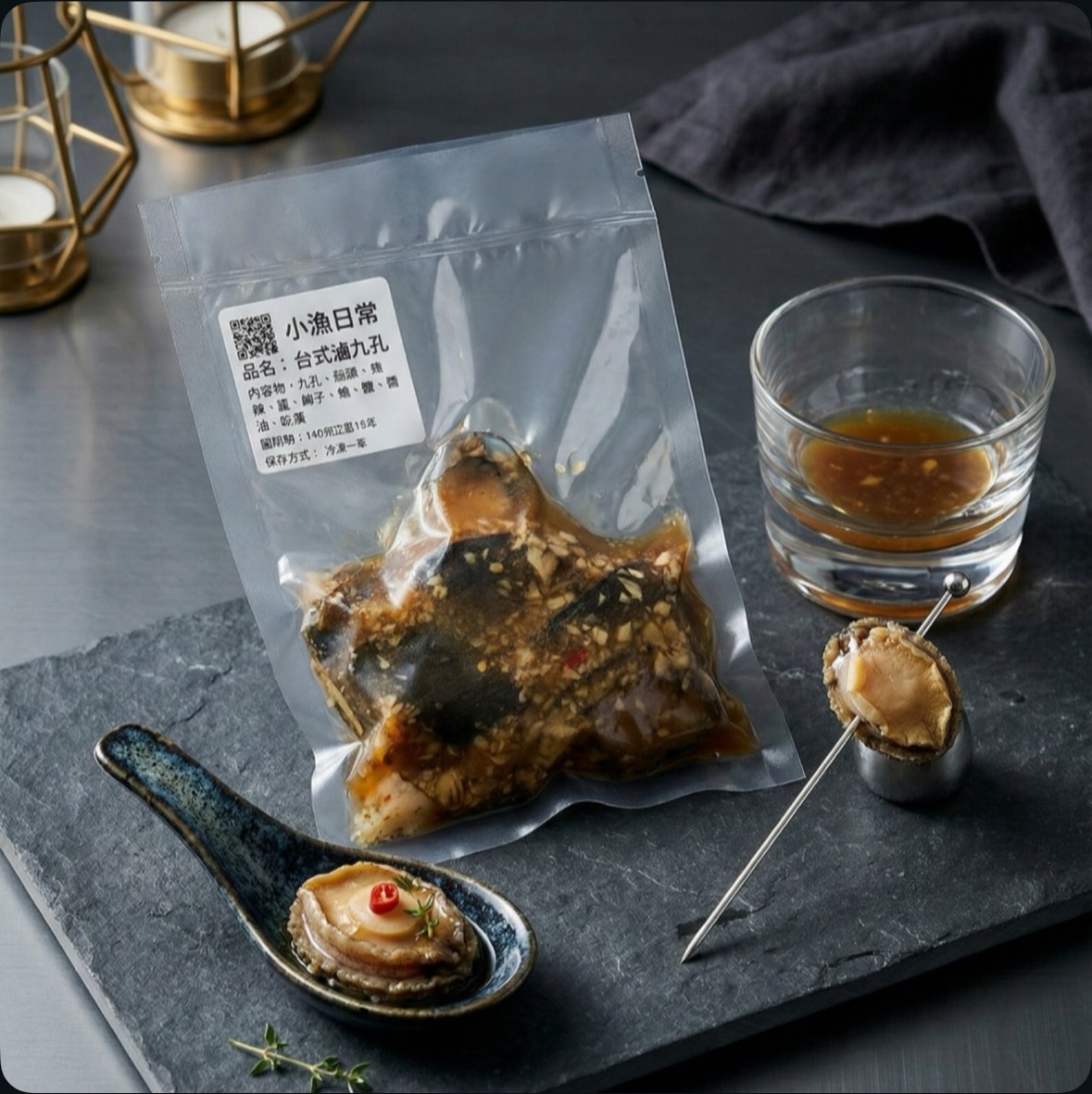 ●成分:九孔、蘿蔔、辣椒、醬油、味霖、柴魚、糖、酒